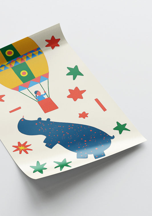 Affiche déco chambre bébé enfant - Hippopotame C géométrie - jaune bleu