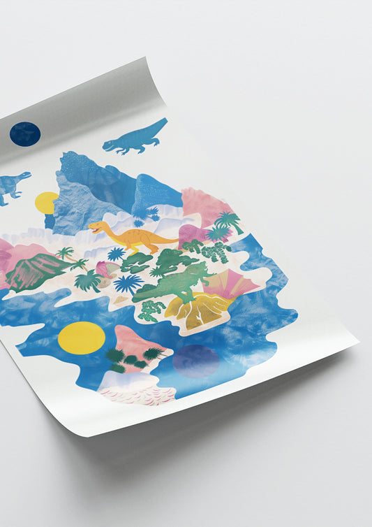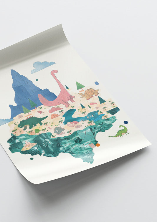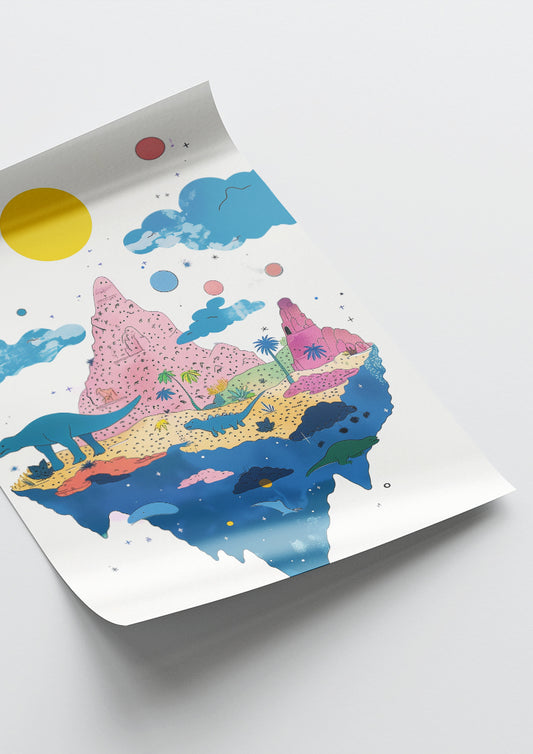 Affiche déco chambre bébé enfant - Dino paysage C - rose bleu