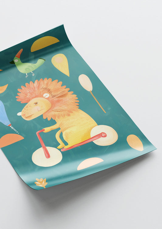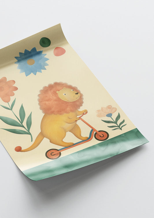 Affiche déco chambre bébé enfant - Trottinette lion A - beige vert