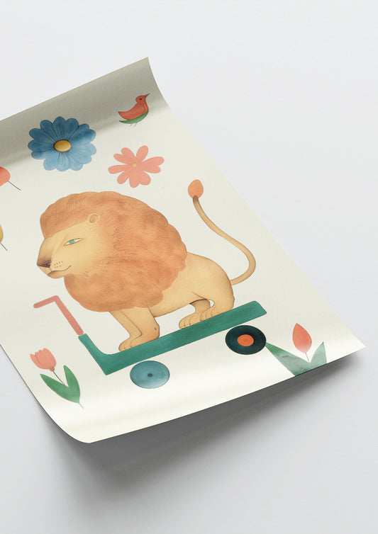 Affiche déco chambre bébé enfant - Trottinette lion B - beige vert