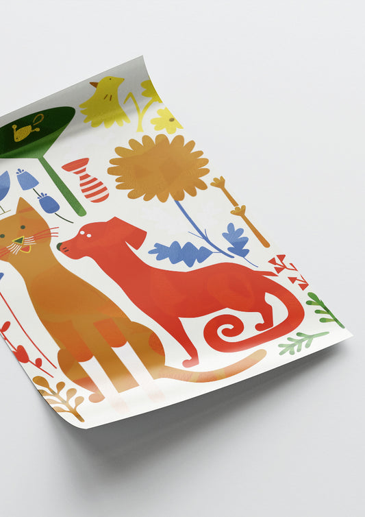 Affiche déco chambre bébé enfant - Chien chat collage B - rouge beige
