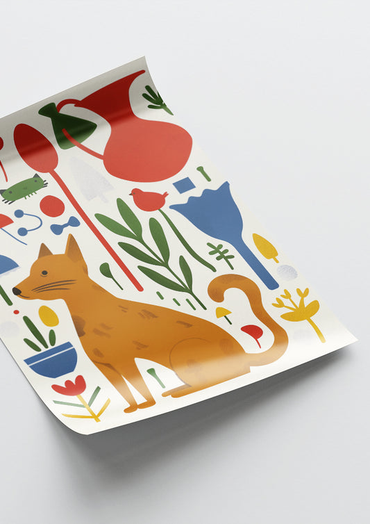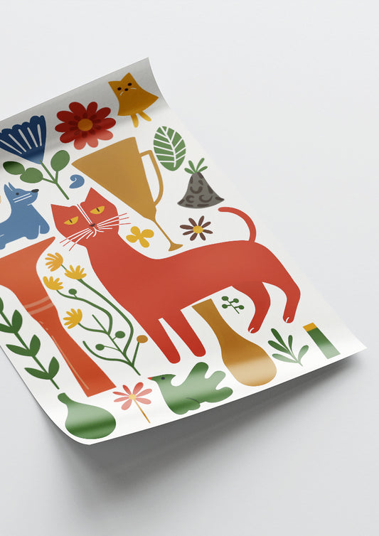 Affiche déco chambre bébé enfant - Chien chat collage C - rouge beige