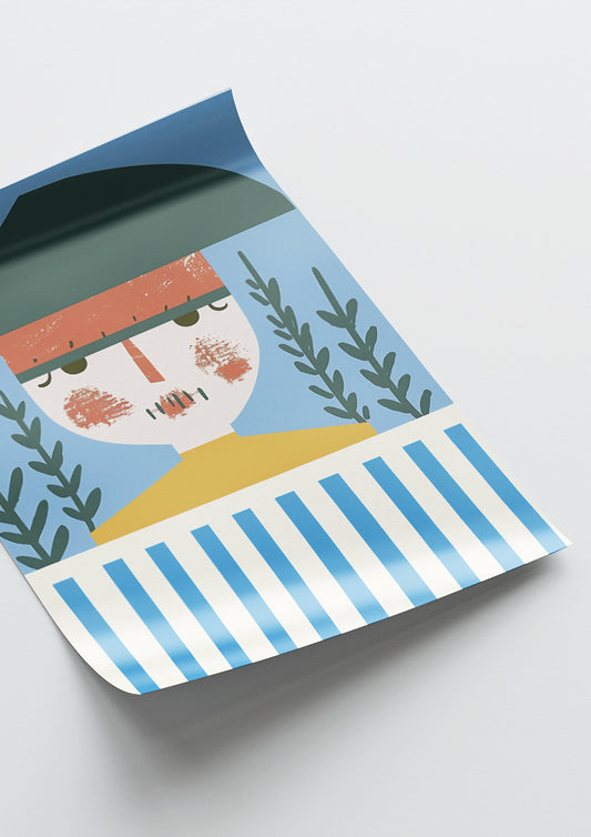 Affiche déco chambre bébé enfant - Portrait pirate bleu A géométrie - bleu jaune
