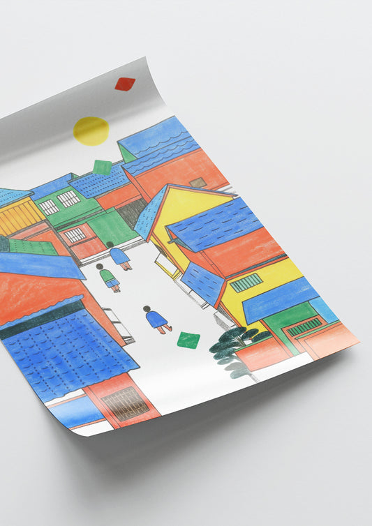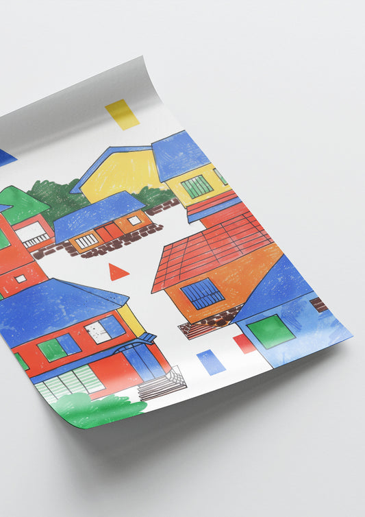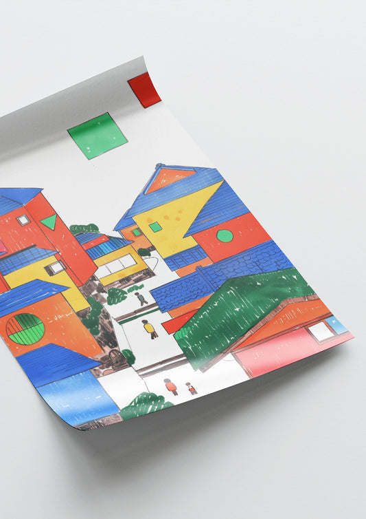 Affiche déco chambre bébé enfant - Japon primaire A géométrie - bleu rouge
